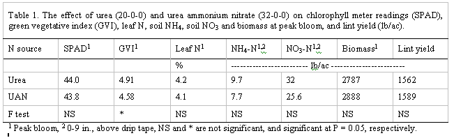 Results: The source of nitrogen did not affect chlorophyll meter readings, leaf N, biomass, NH4-N, or NO3-N at peak bloom (Table 1). The Green vegetative index (GVI) at peak bloom was greater with urea than with urea ammonium nitrate (UAN). Lint yields were not affected by the N source. Multiple years of similar data need to be collected before conclusions can be made about the importance of N source on subsurface drip irrigated cotton.