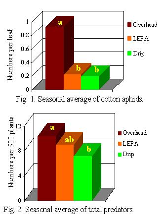 Methodology: Experimental plots of Paymaster 2379RR cotton were planted on May 7, 2002 at the Helms Research Farm located near Halfway, Texas. The experiment had a completely randomized design (CRD) with three treatments and four replications. The three treatments included low energy precision application (LEPA), overhead spray irrigation and drip irrigation. Cotton was planted (approximately 56,000 seeds per acre) in 30-inch rows and 100 lbs of nitrogen per acre was applied through irrigation systems to all treatment plots. Insect pests and predators were sampled at weekly intervals by a vacuum sampling method from June 17 to September 19, 2002. The two-cycle backpack aspirator equipped with a 21.2 cc engine (Model 1612, John W. Hock Company, Gainesville, FL) was used for 30 seconds per plot to vacuum insects from an estimated 500 cotton plants per plot. Cotton aphids were sampled weekly from July 22 to September 26, 2002 by visually inspecting 5 top and 5 bottom leaves from each plot. Cotton aphid data were converted to average numbers per leaf and the predator data were reported as total numbers per 500 plants.